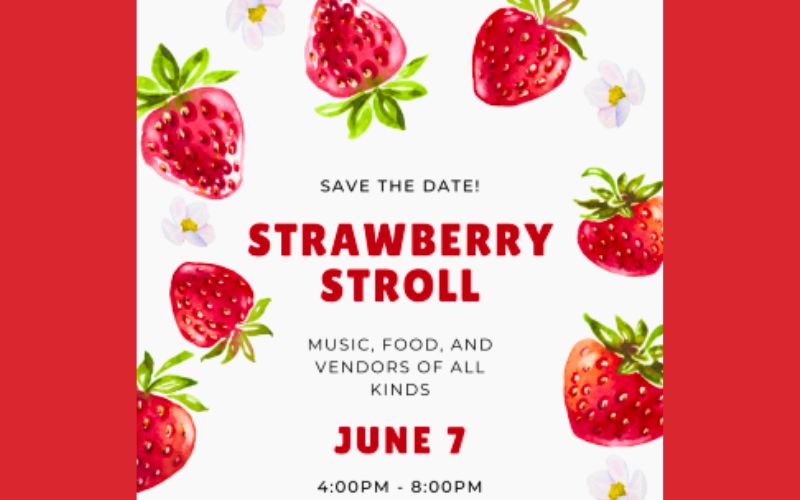 The 20th Annual Strawberry Stroll is ready to go. This town favorite is set for Friday, June 7 from 4 to 8 pm. The rain date is Saturday the 8 th from 4 to 8 pm. The stroll is on Main Street which will be closed to traffic so visitors can easily and safely walk.