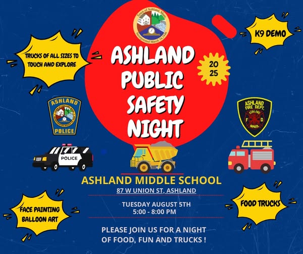 Join us on Tuesday, August 5th from 5:00–8:00 PM at Ashland Middle School for an exciting, family-friendly event packed with activities and demonstrations from Ashland’s Police, Fire, and DPW teams.