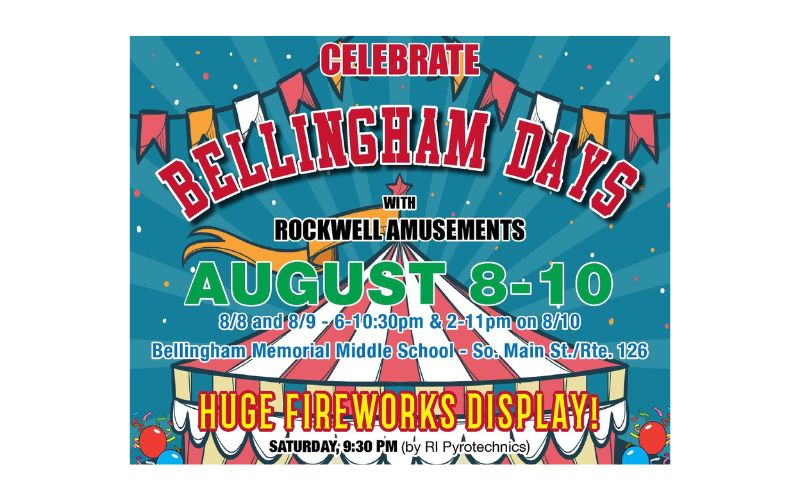 Bellingham Days will once again take place at the Memorial Middle School with a carnival on the 8th, 9th and 10th with Fireworks and a concert on the 10th.
