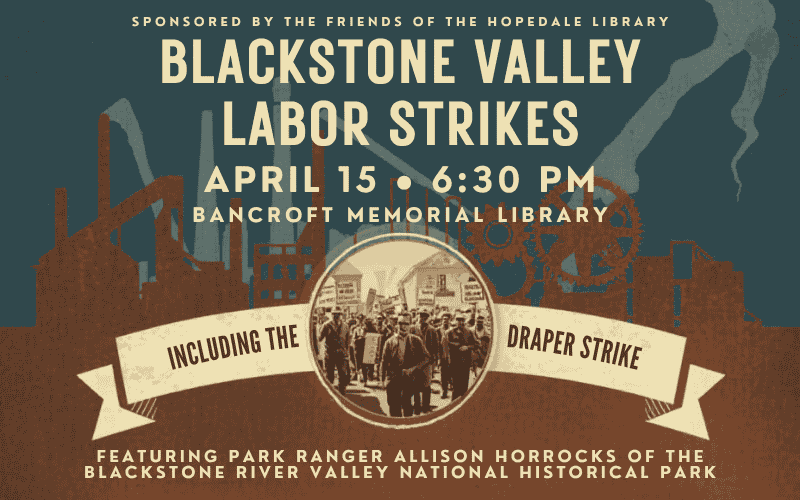 Join us as Park Ranger Allison Horrocks of the Blackstone River Valley National Historical Park presents a talk on labor activism in the Blackstone Valley, exploring the region’s pivotal role in the history of American workers’ movements. From early mill protests to the 1913 Hopedale labor strike at the Draper Company, Horrocks will examine how workers across the Valley organized to challenge wages, working conditions, and corporate power during the rise of industrialization. Drawing on stories from the mills and communities that shaped the Valley, the presentation highlights the people and events that made the region an important center in the struggle for workers’ rights.