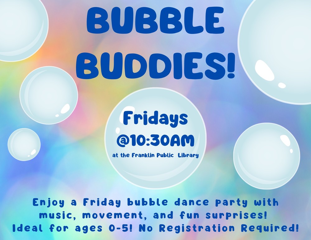 Enjoy a Friday bubble dance party with music, movement, and fun surprises!