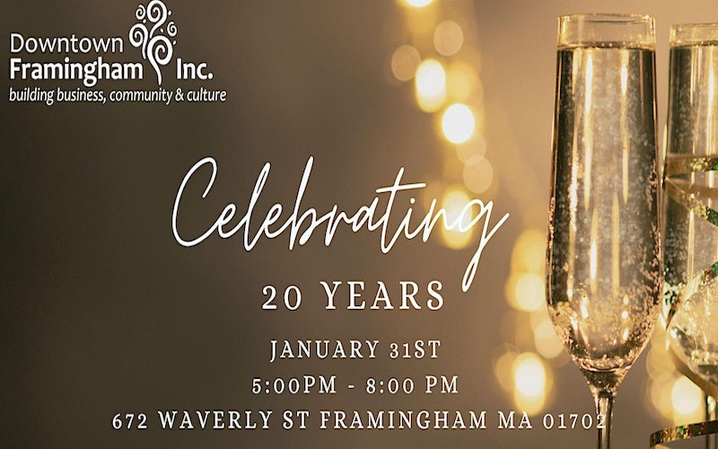 Come join us for the celebration of Downtown Framingham Inc.’s 20th Anniversary! This exciting event will take place on Wednesday, January 31, 2024 at 672 Waverly St.