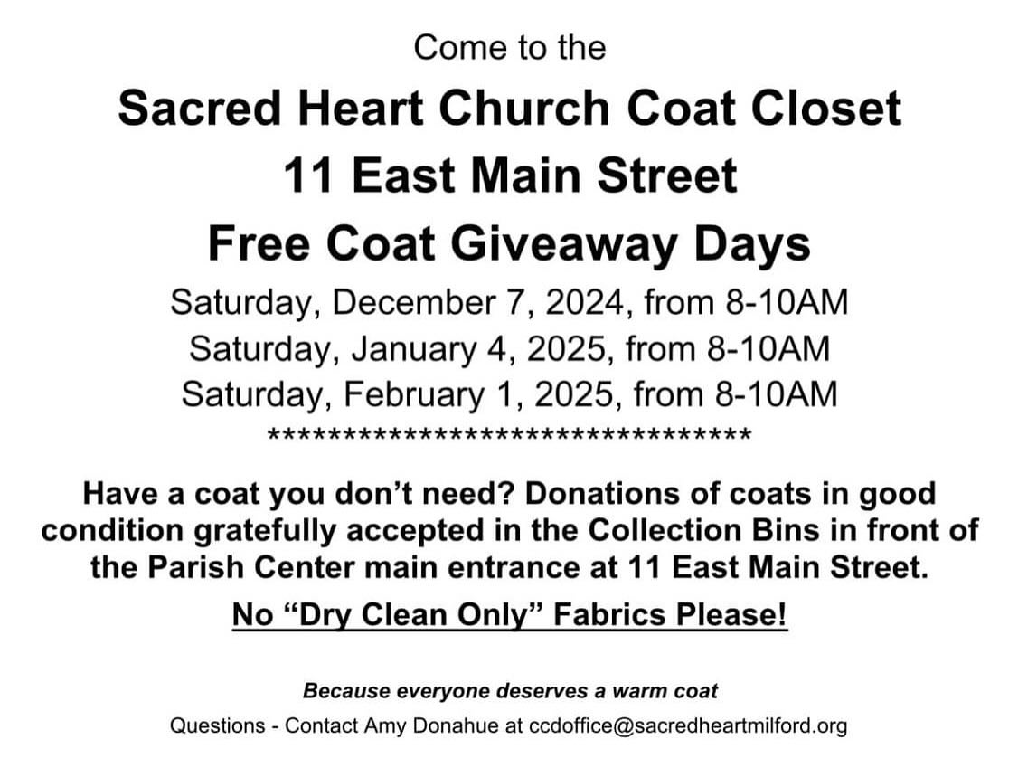 Sacred Heart Church in Milford is hosting Free Coat Giveaway Days at their Coat Closet, located at 11 East Main Street. If you or someone you know needs a coat, stop by on the following dates: