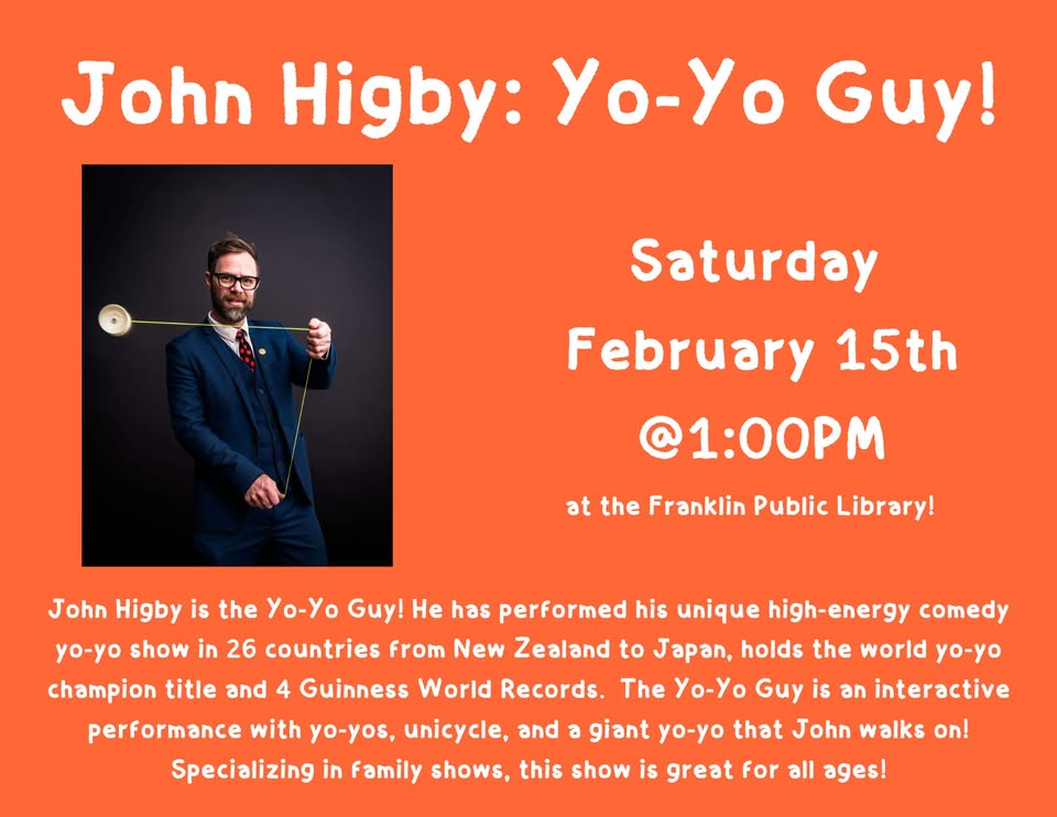 Join us for a one-of-a-kind performance by John Higby, internationally known as The Yo-Yo Guy! He has amazed audiences in 26 countries, from New Zealand to Japan, and holds the World Yo-Yo Champion title along with four Guinness World Records!