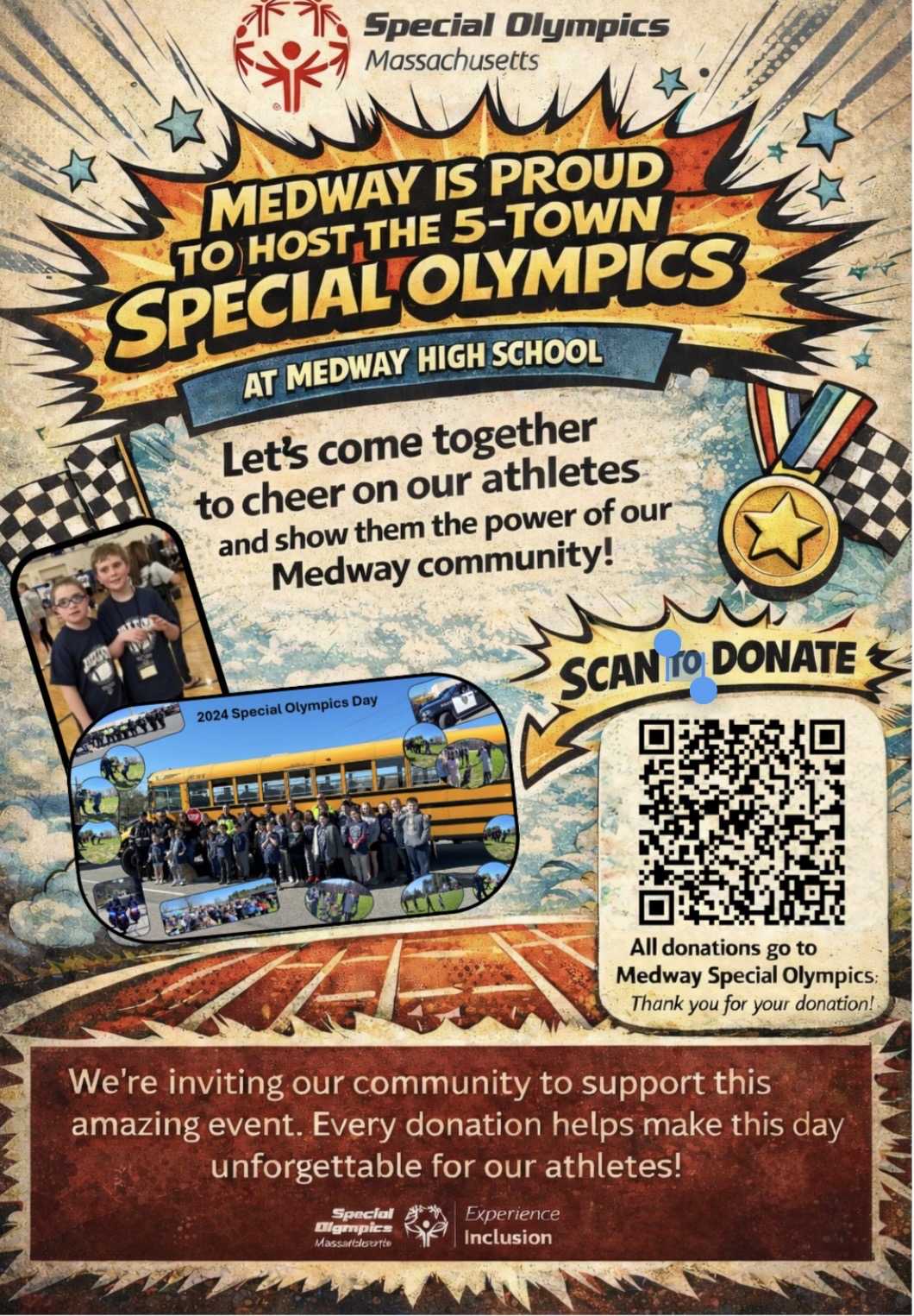 On April 28th, Medway High School, in conjunction with Special Olympics Massachusetts will be hosting the 12th annual 5 Town School Day Games! Approximately 100 students with intellectual disabilities from Ashland, Holliston, Medfield, Medway, and Millis will train and compete to showcase their athletic skills.  Help support our amazing game day that promotes inclusion, acceptance, and respect among school culture!