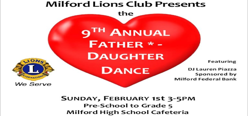 Milford Lions Club is hosting its 9th Annual Father Daughter Dance on February 1, 2026 at the Milford High School Cafeteria from 3:00 PM to 5:00 PM. $30.00 per adult with one child. $5.00 for each additional child.