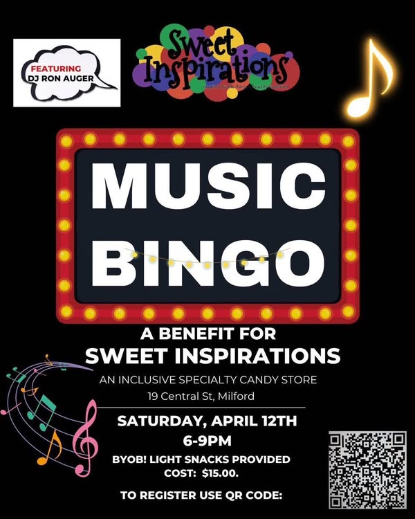 Get ready for a night of music, fun, and community spirit — all for a sweet cause! Join us for Music Bingo, a lively benefit event in support of Sweet Inspirations, Milford’s inclusive specialty candy store.