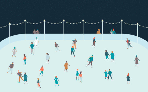 Happy people skating on the ice rink. Man and Woman Characters Have Fun Together. Christmas Holidays Concept. Cozy winter evening activities. Cartoon flat vector Illustration