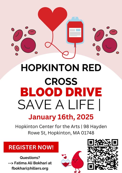 Make a difference in your community by donating blood at the Hopkinton Red Cross Blood Drive! This life-saving event will take place on January 16th, 2025, at the Hopkinton Center for the Arts, 98 Hayden Rowe St., Hopkinton, MA. Every drop counts, and your contribution could save multiple lives. Take a moment to register today and be a hero for those in need. Questions? Reach out to Fatima Ali Bokhari at [email protected]. Together, let’s make an impact and help those who rely on life-saving donations. Don’t wait—register now and save a life!