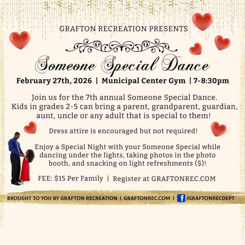 This is for students in Grafton. Join us for the 6th annual ‘Someone Special’ Dance. Bring Mom, Dad, a grandparent, guardian, aunt, uncle or any adult that is special to you! For Grades 2 – 5. At the Municipal Center Gym from 7-8:30pm. Dress attire is encouraged but not required! Enjoy a Special Night with your Someone Special while dancing under the lights, taking photos in the photo booth, and snacking on light refreshments ($)!