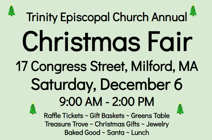 Trinity Church Christmas Fair showcases the talents of our parish. Our famous Traveling Bazzar Raffle has over 25 prizes with a $500 cash grand prize. We will have fresh greens arrangements and wreaths available, gentlty used jewelry, handmade crafts and ornaments, gift basket raffle and baskets for teachers and besties. You might find something at our Treasure Trove and get a photo with Santa. Finish you time with us and have some lunch and homemade baked goods. We hope you can join us!