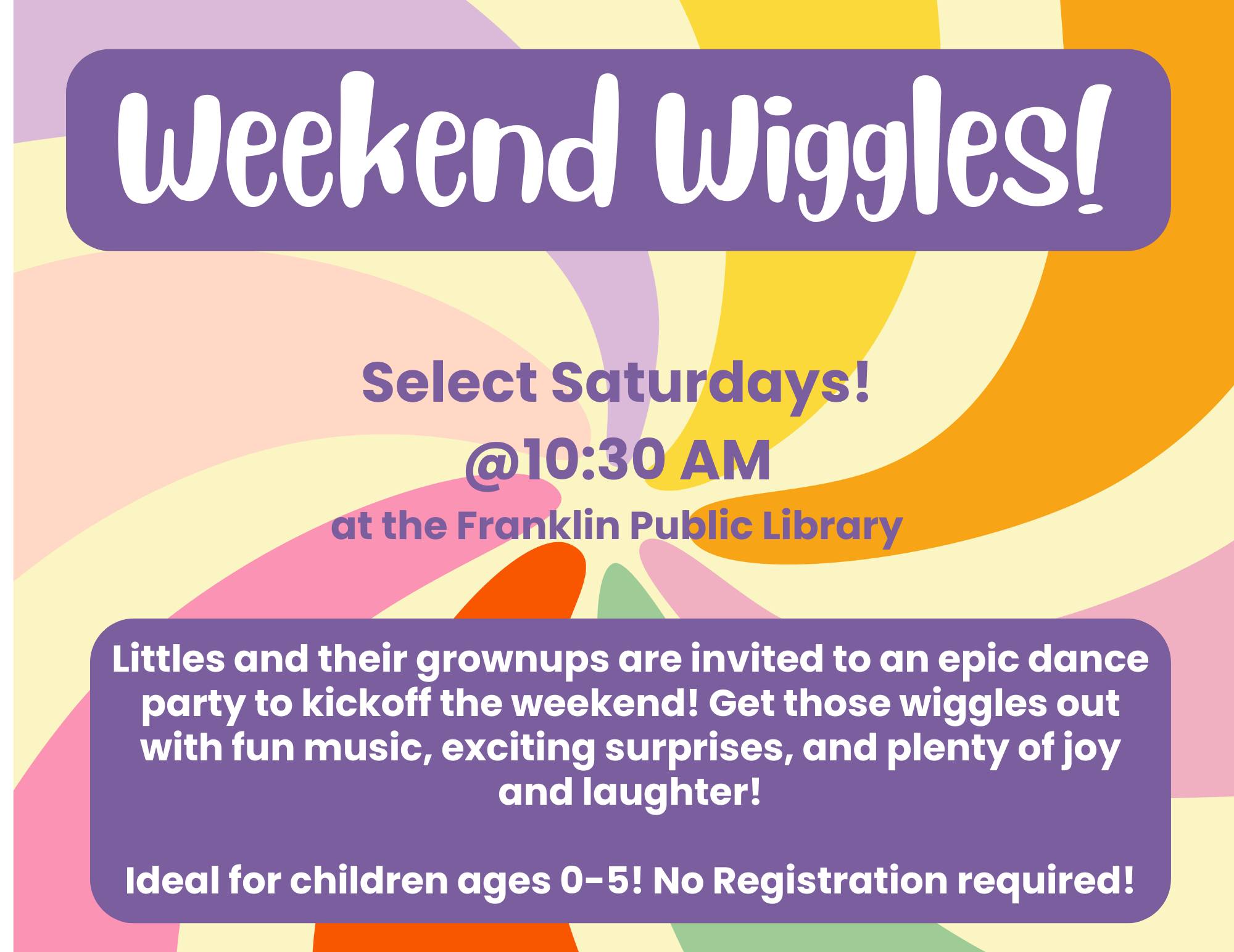 Littles and their grownups are invited to an epic dance party to kickoff the weekend! Get those wiggles out with fun music, exciting surprises and plenty of joy and laughter!