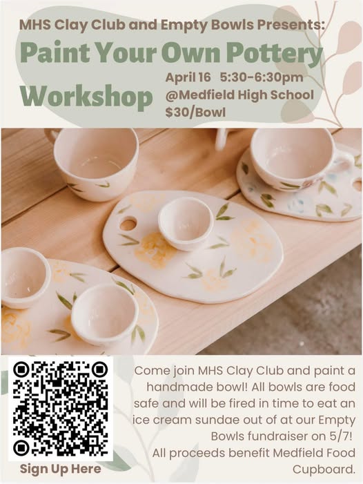 MEDFIELD – The Medfield High School will host two upcoming community events — a “Paint Your Own Pottery” workshop on April 16th and the “Empty Bowls” fundraiser on May 7th — both benefiting the Medfield Food Cupboard.